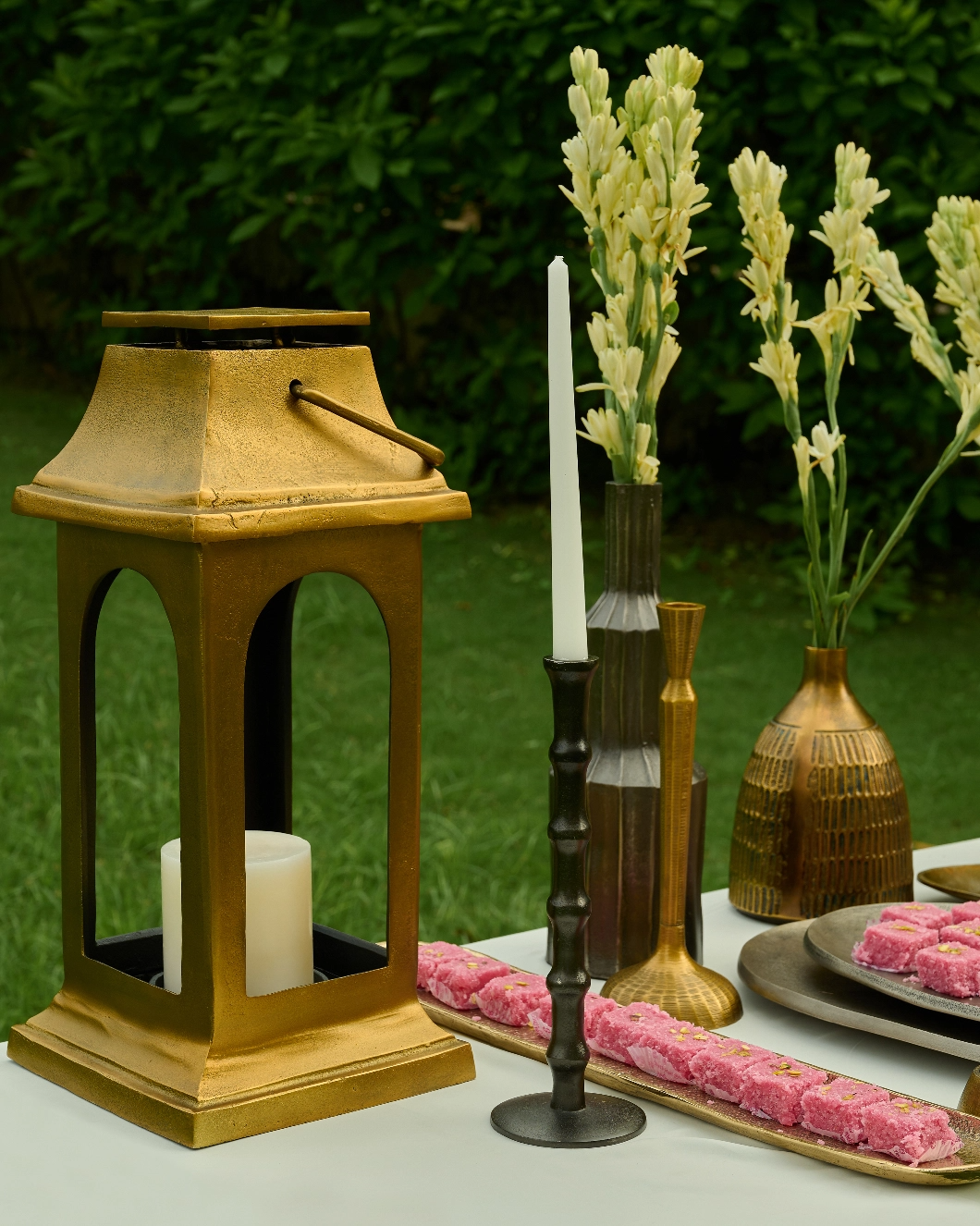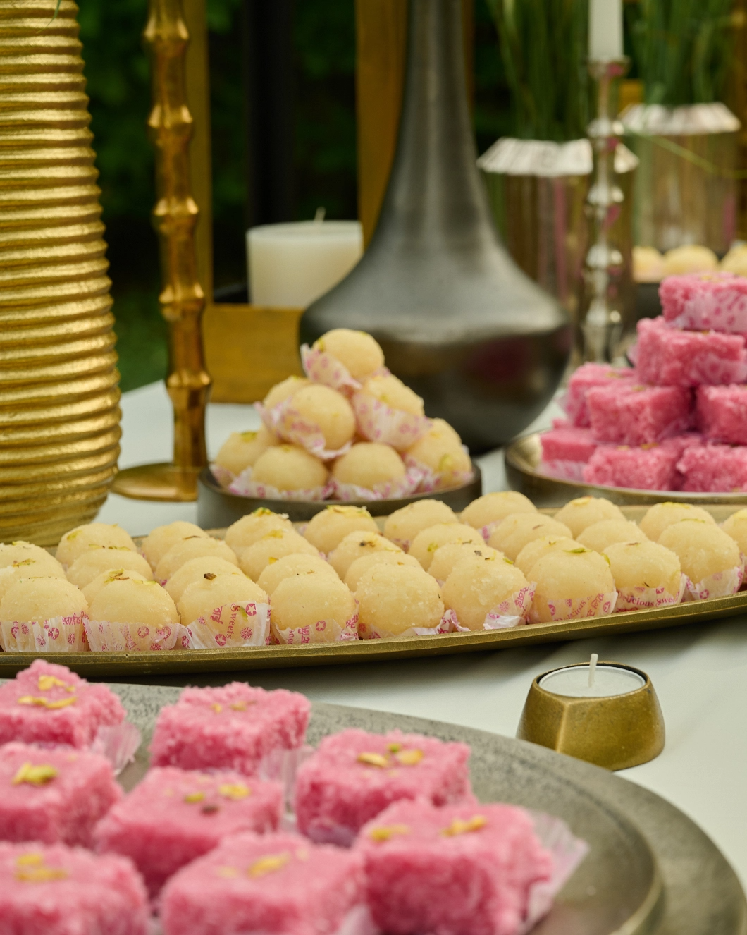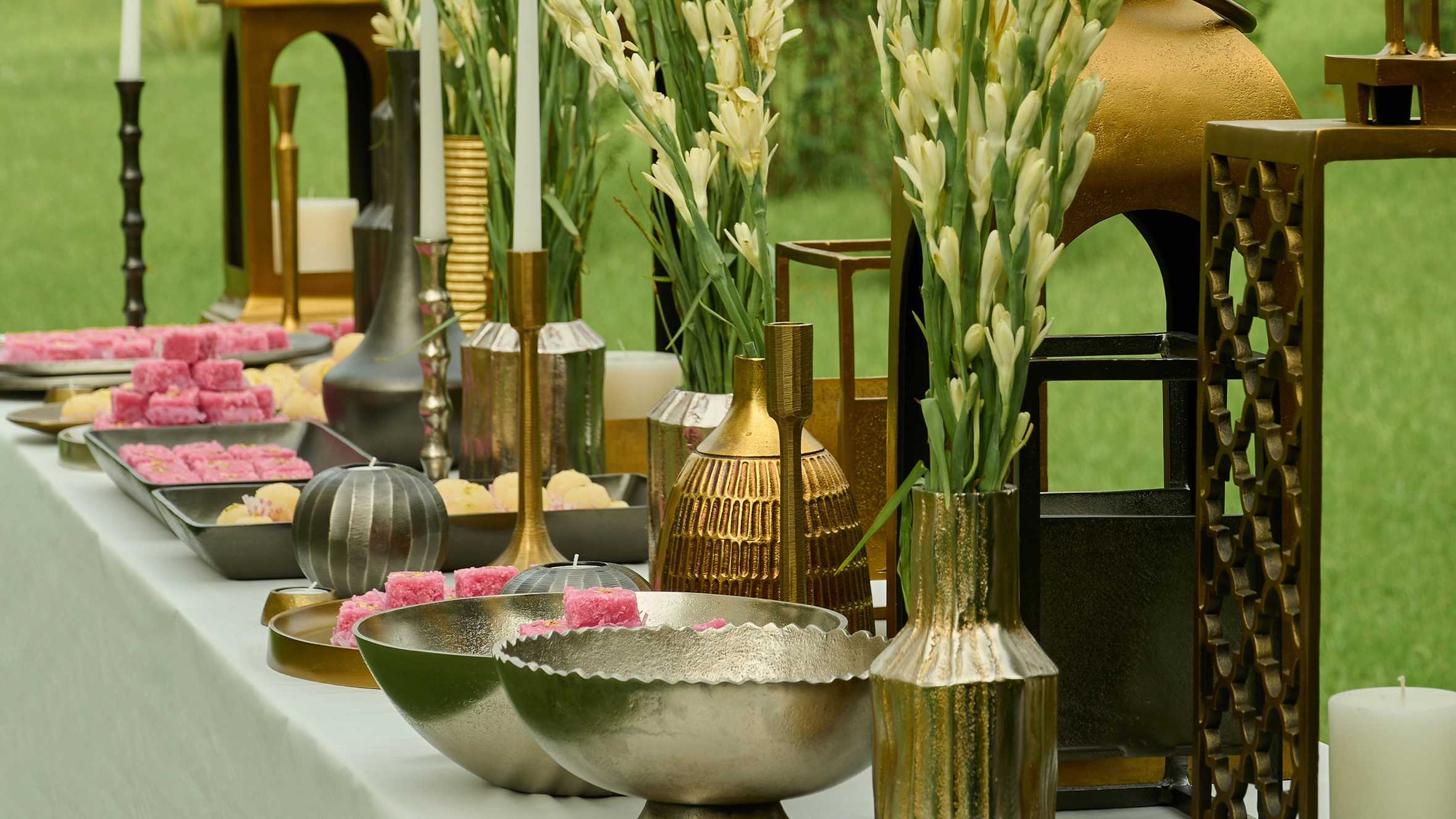 The Mithai Table is an architecture of hosting. Hammered brass vessels, pedestal trays, and gleaming lanterns compose a tableau where mithai is less served, more displayed.