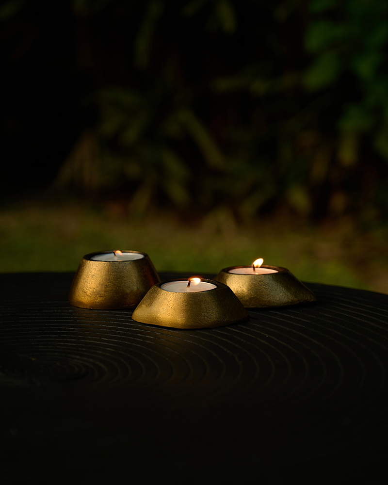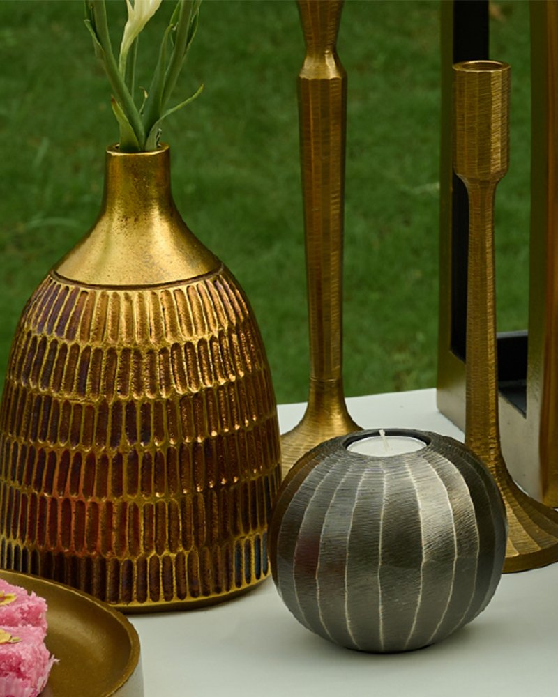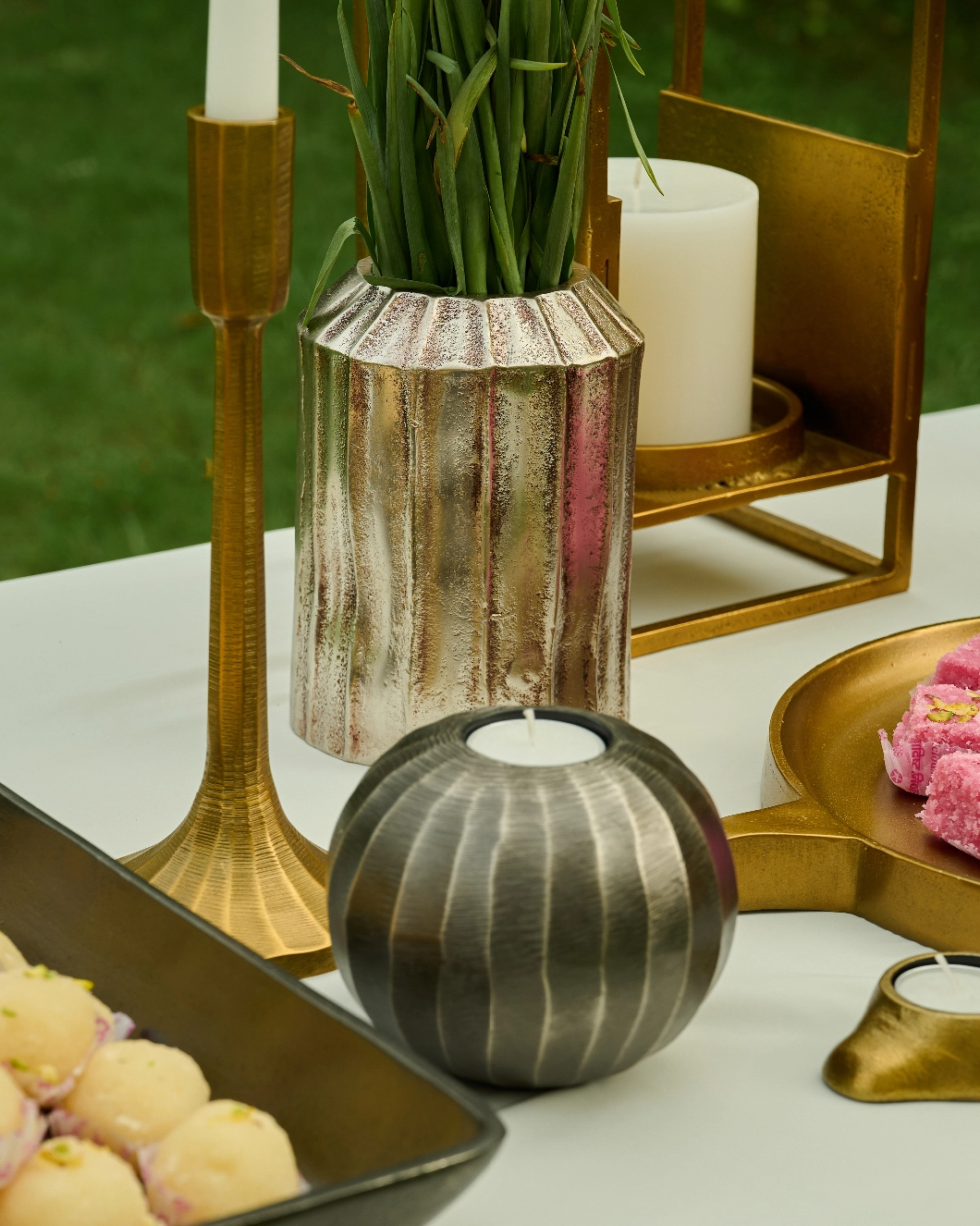 The Mithai Table is an architecture of hosting. Hammered brass vessels, pedestal trays, and gleaming lanterns compose a tableau where mithai is less served, more displayed.