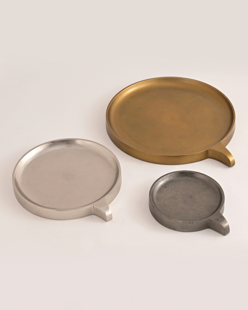 - Niva Platters: Designed in black nickel, brass antique, and polished nickel finishes, the Niva Platters are conceived for the generosity of serving and the elegance of display. Their varied scales and finishes allow for layering, whether styled with festive sweets, floral arrangements, or left bare as objects of understated luxury. In the world of festive décor gifting, they exemplify what it means to give with permanence: pieces that move fluidly between celebration and everyday ritual.