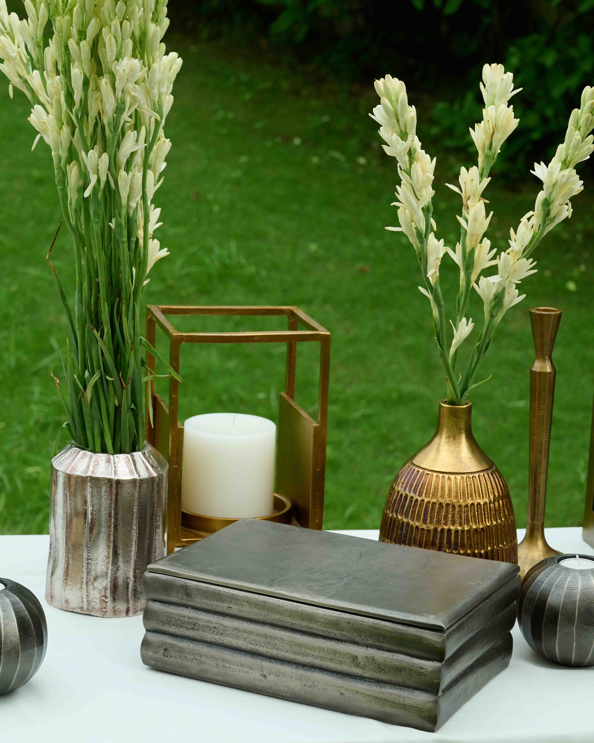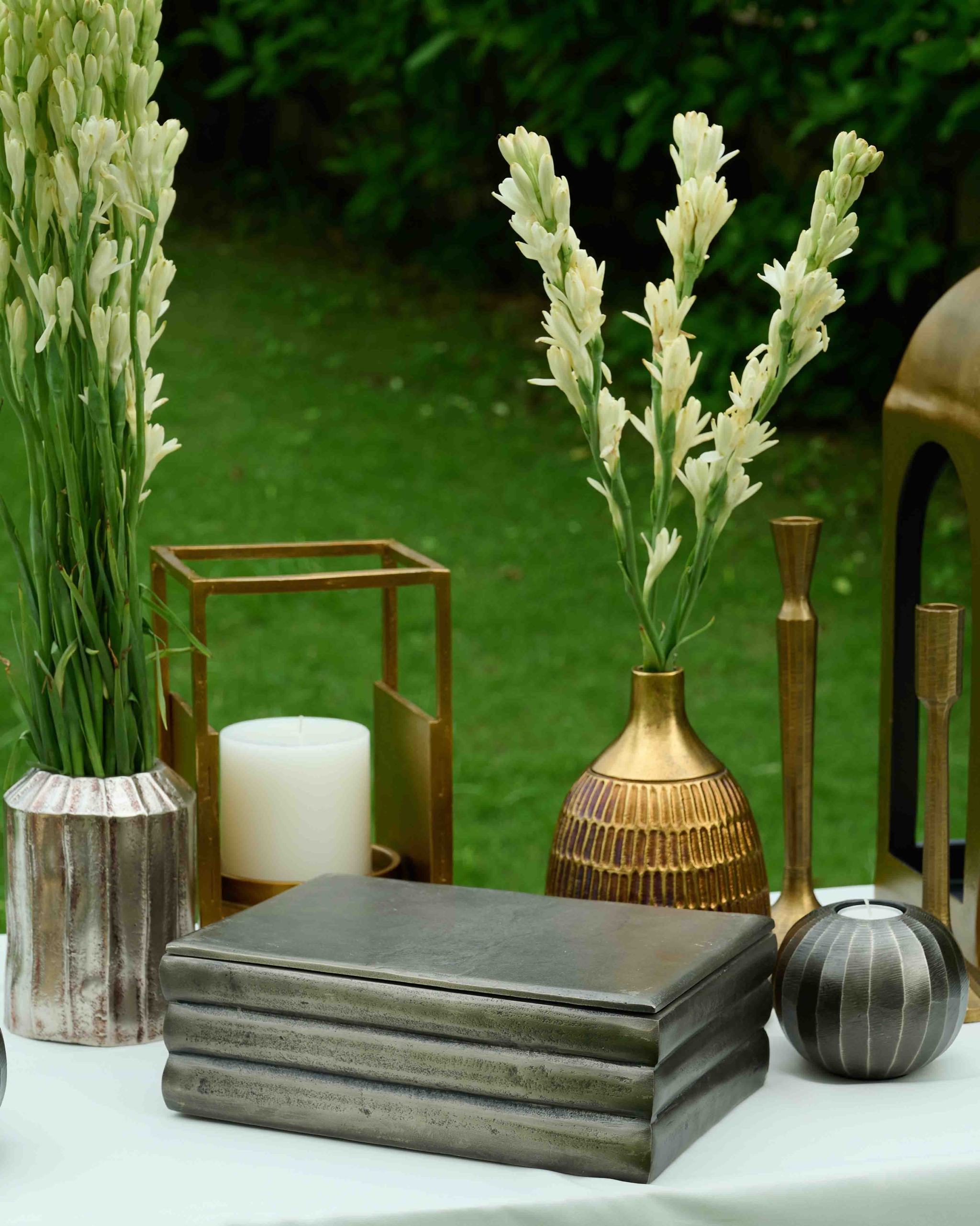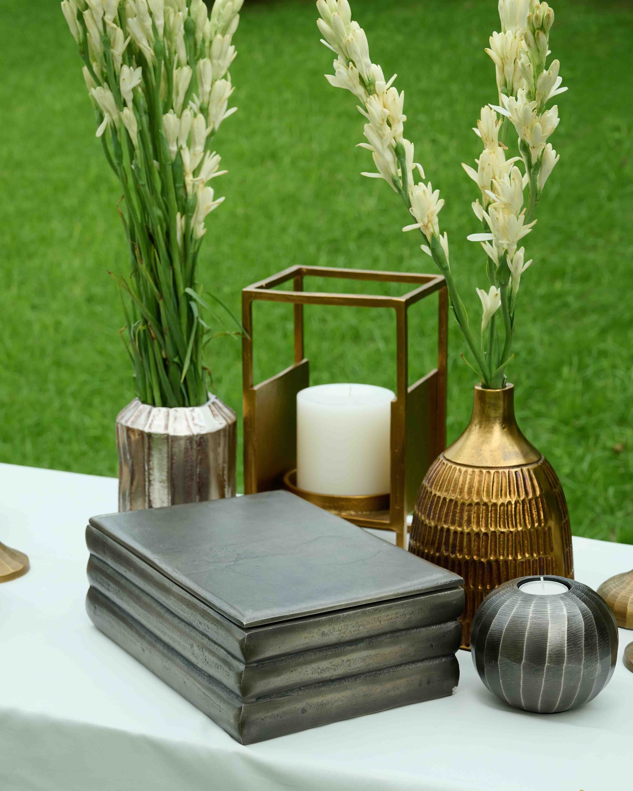 The Granth Box is a sophisticated and symbolic storage piece, crafted from premium cast aluminium, that embodies both heritage and timeless elegance. The name “Granth,” which translates to “book” or “scripture” in Sanskrit, holds deep cultural significance as it represents knowledge, wisdom, and the preservation of traditions. This box is not only a functional storage solution but a tribute to the written word, knowledge, and cultural legacies passed down through generations. The Granth Box is a perfect blend of artistry, durability, and reverence for ancient traditions, ideal for those who value heritage and symbolism in their decor.
