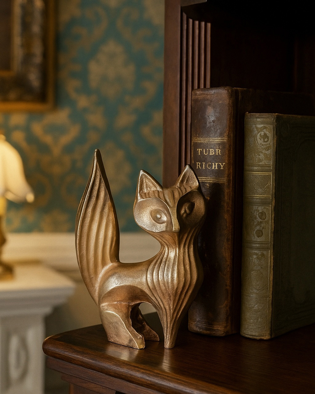 The smooth metallic finish enhances its sleek contours, making it a striking accent for consoles, bookshelves, or curated tabletop arrangements. Whether displayed as a standalone piece or alongside other decorative objects, the Luna Fox brings a sense of quiet sophistication and personality to any space.