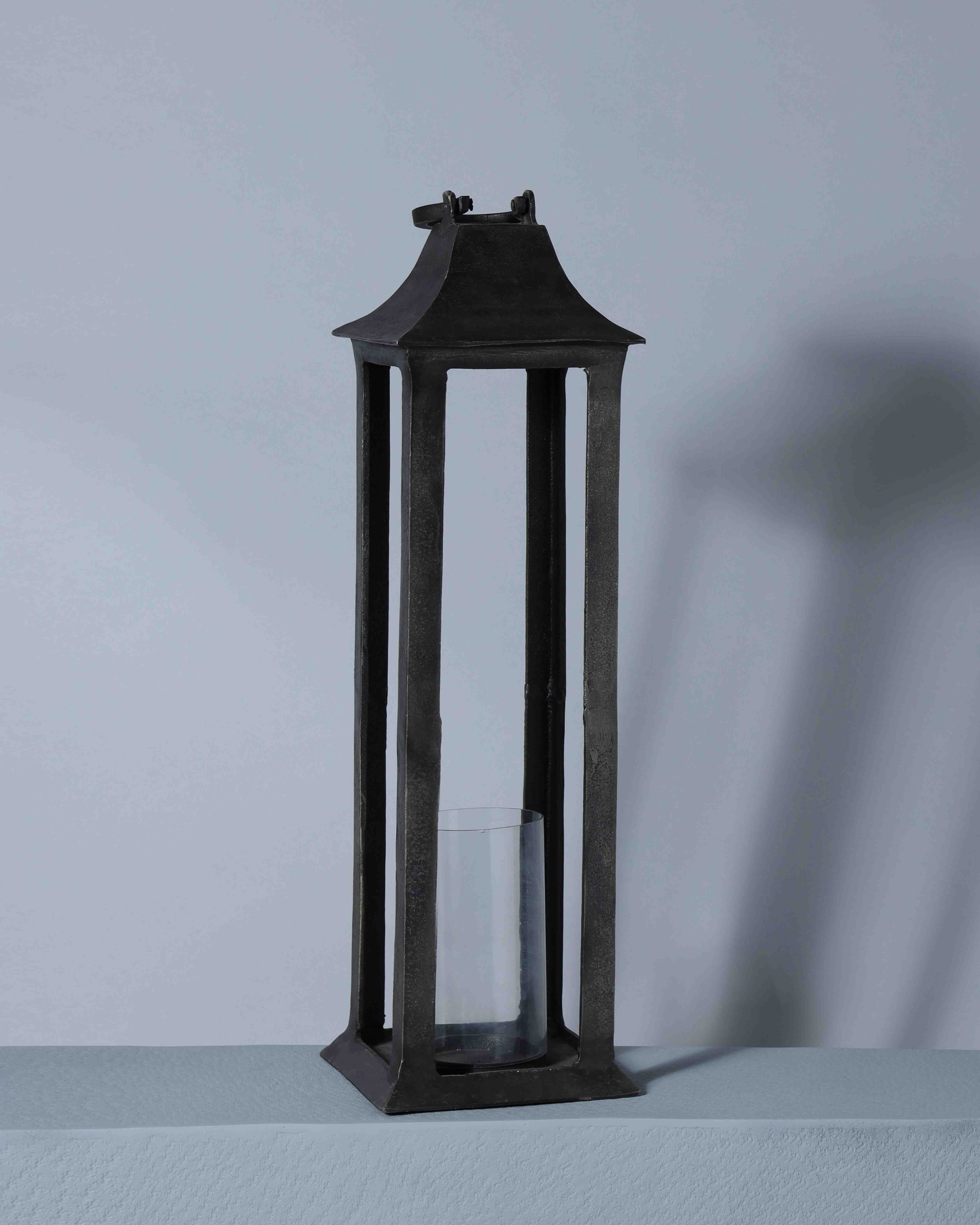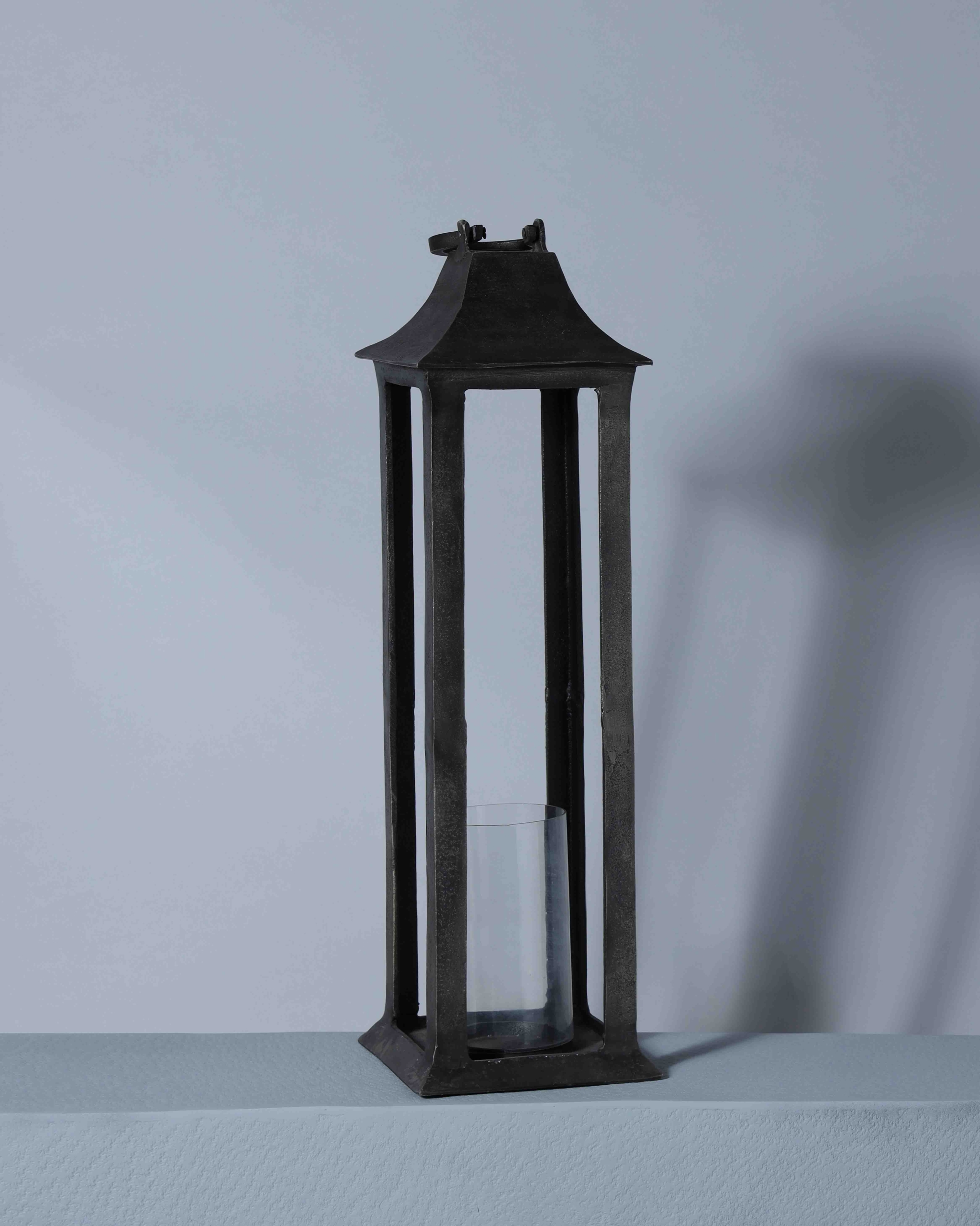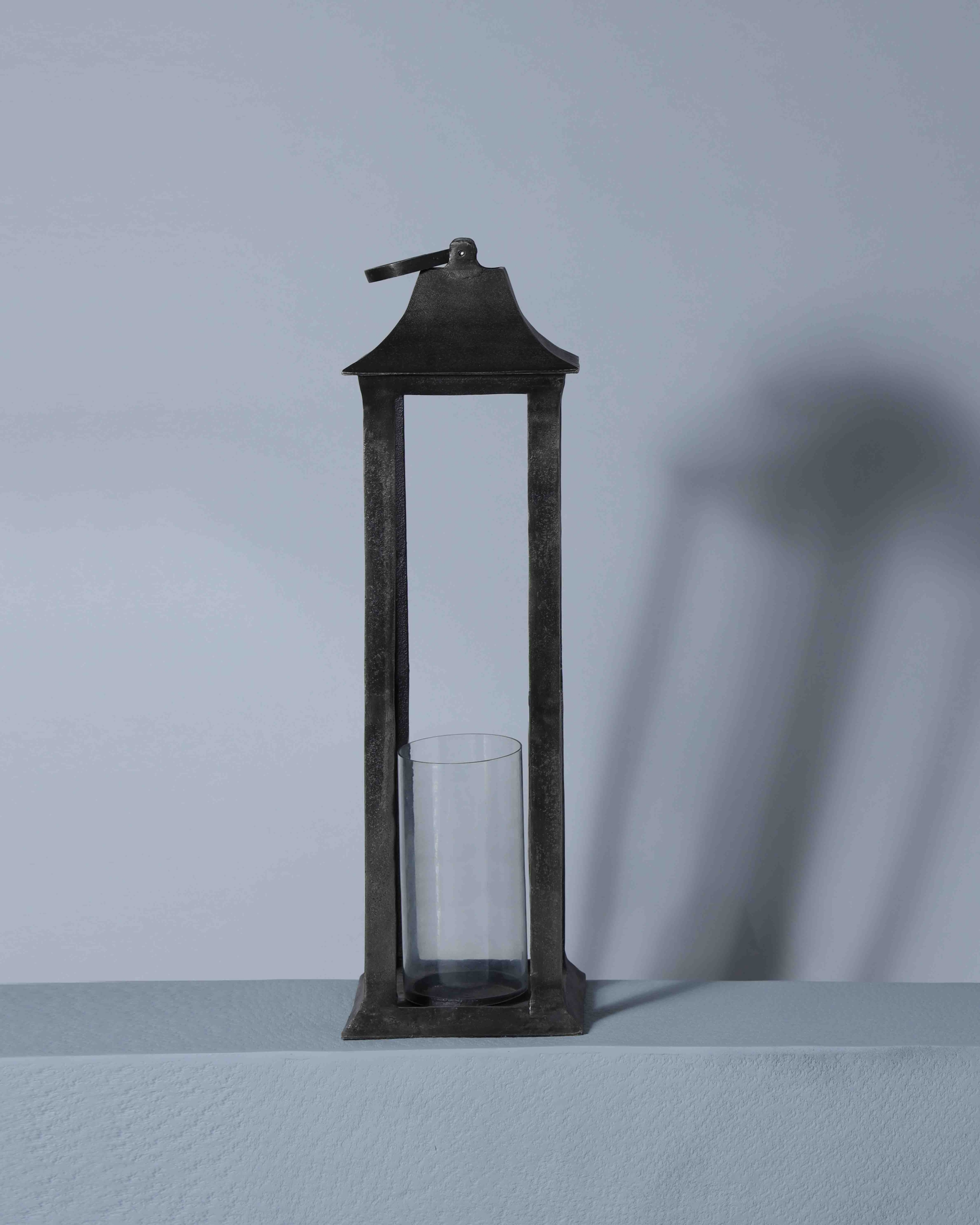 The classic graphite aluminium Smyth lantern goes geometric. Place one on either side of the fireplace mantel or group with our smaller and taller Smyth lanterns for a dramatic candlelight display on the patio.