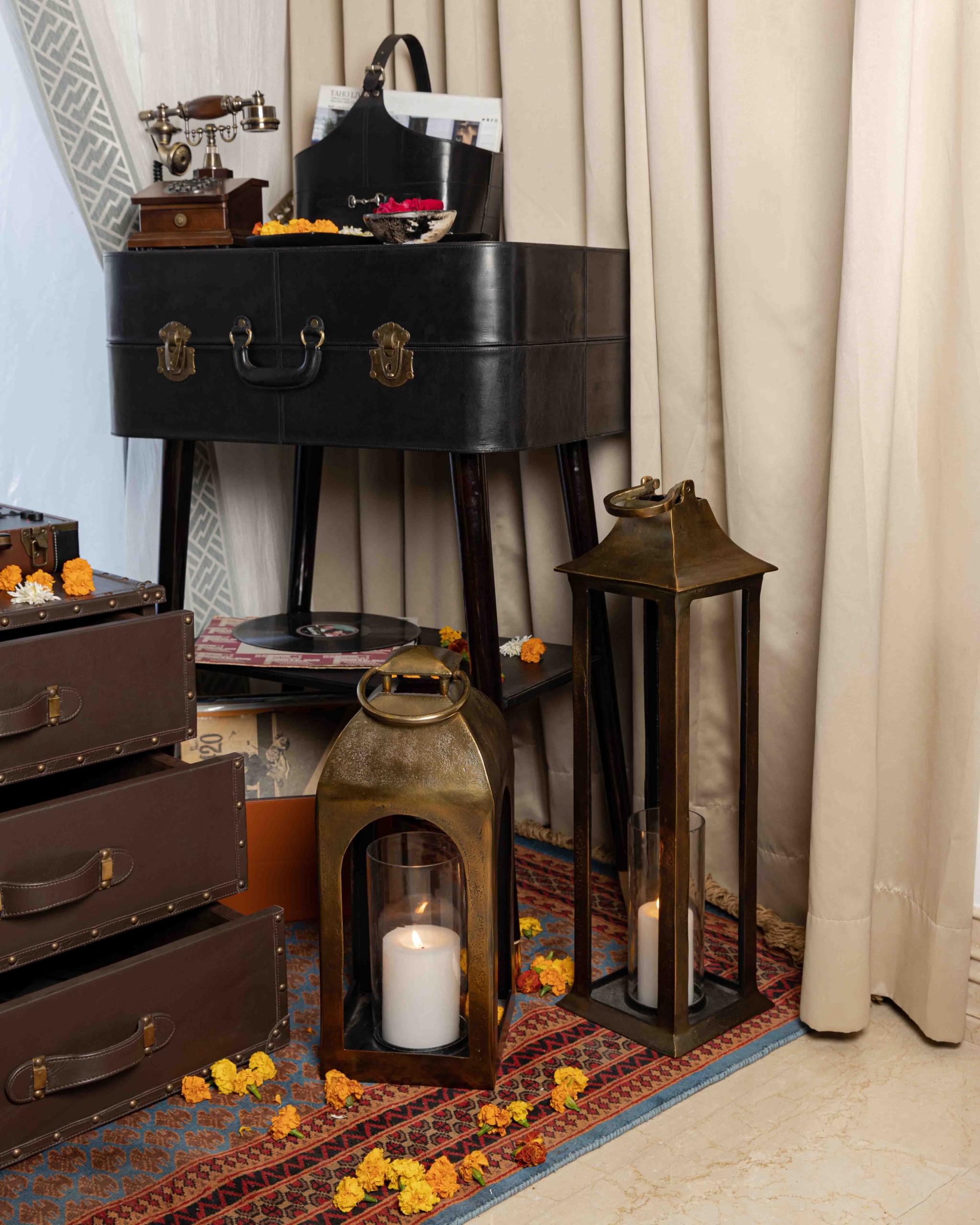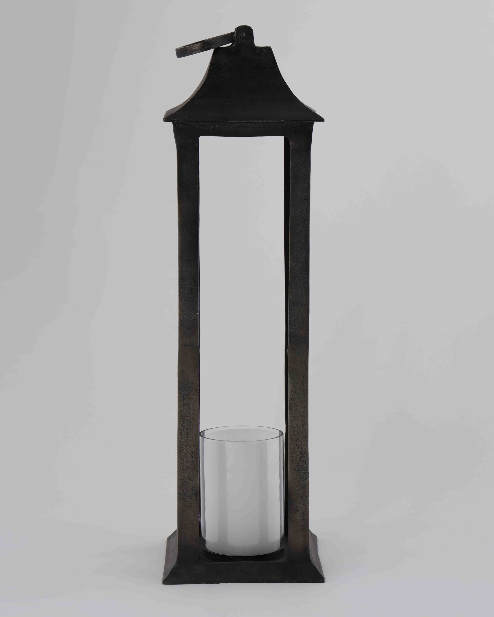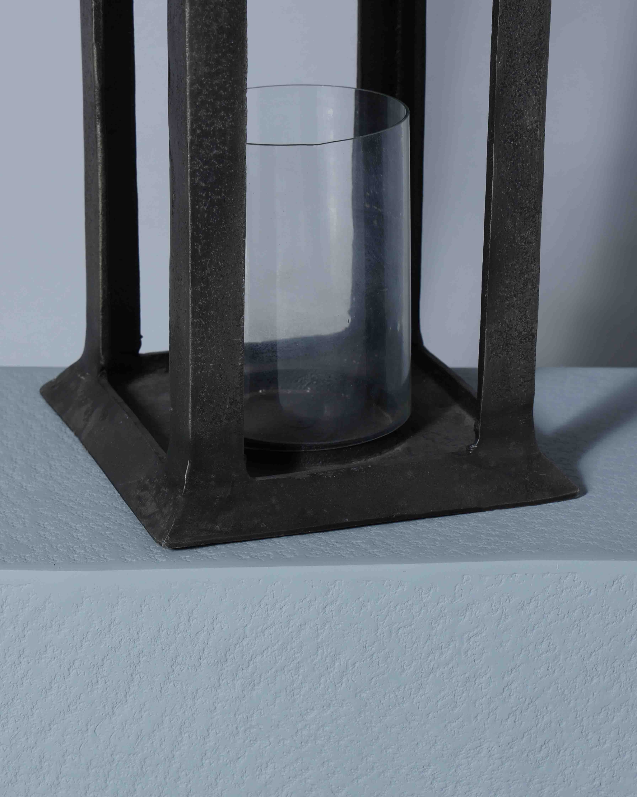 The classic graphite aluminium Smyth lantern goes geometric. Place one on either side of the fireplace mantel or group with our smaller and taller Smyth lanterns for a dramatic candlelight display on the patio.