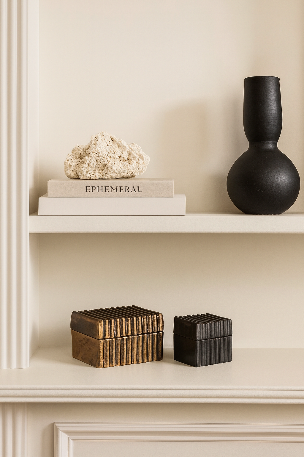 The Trayva Box Set is a beautiful collection of two boxes, each crafted with precision from high-quality cast aluminium. The name “Trayva,” meaning “treasure” or “valuable” in Sanskrit, reflects the true nature of these stunning boxes. Whether as a standalone piece or as a set, these boxes bring together the timeless beauty of superior craftsmanship, elegant design, and functional storage. A perfect blend of artistry and practicality, the Trayva Box Set is designed to protect and elevate your most cherished belongings.