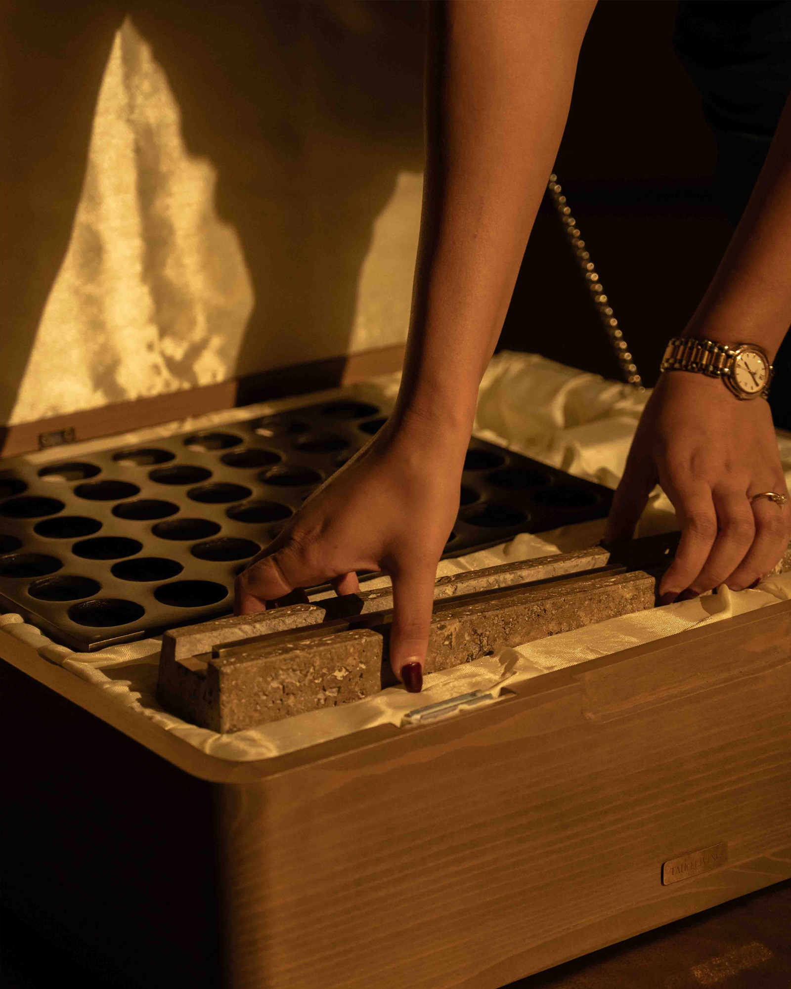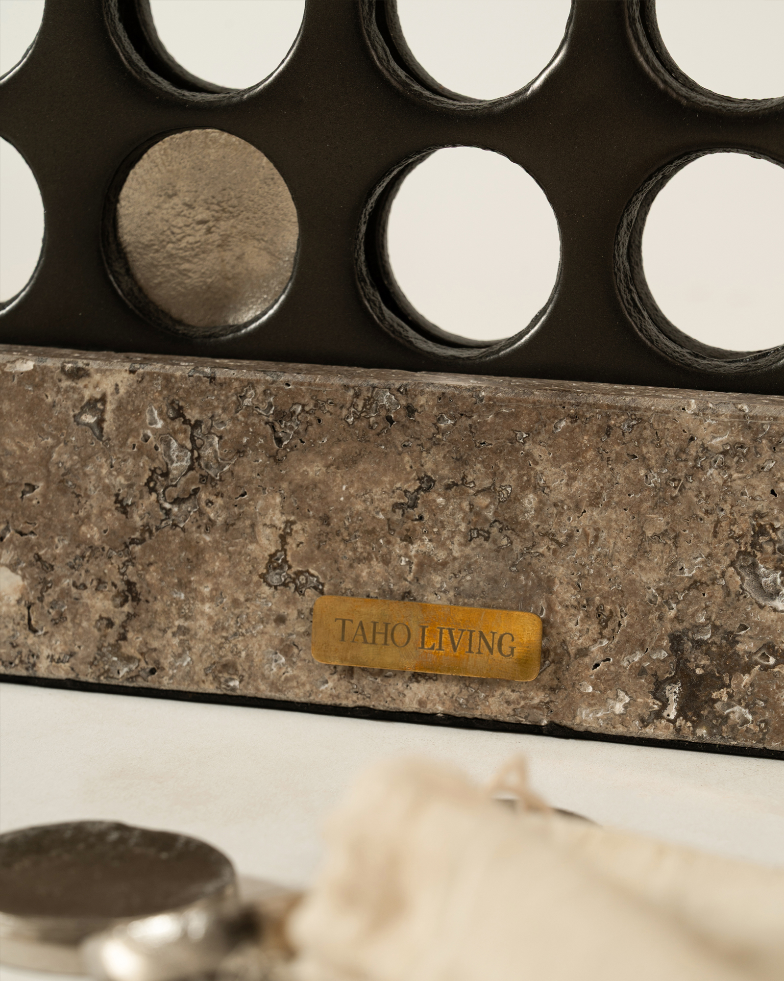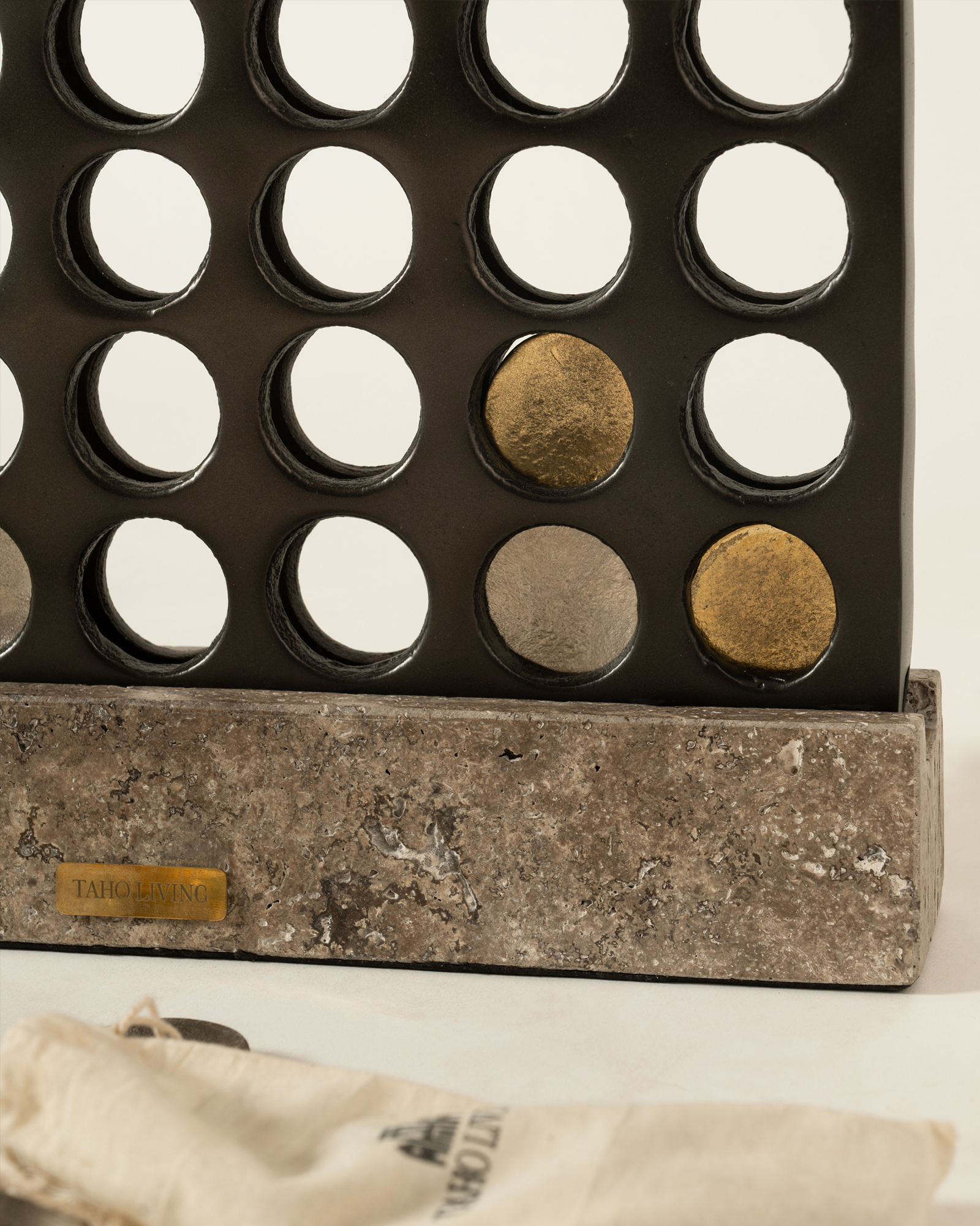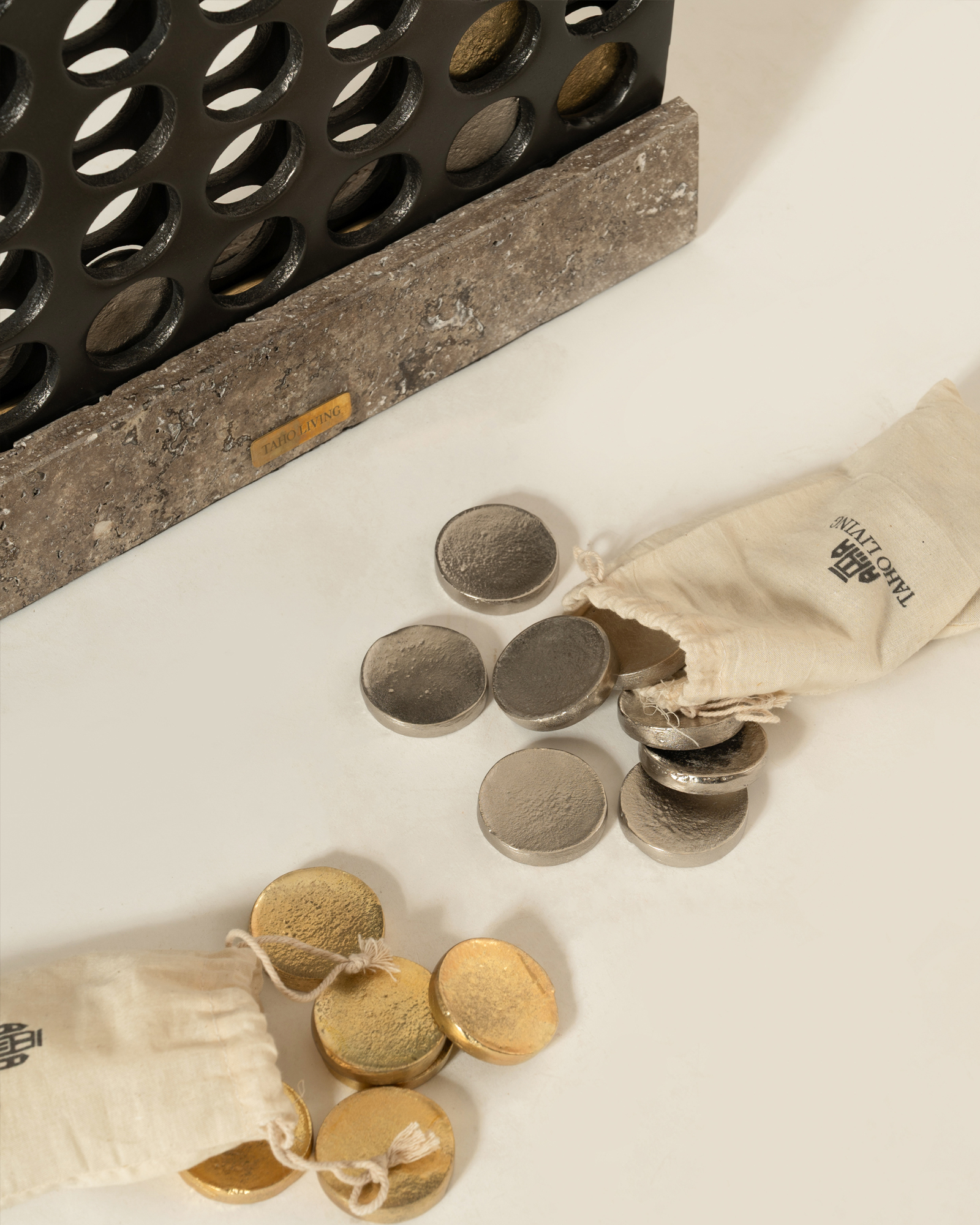 Alignment Four In A Row Game reimagines a familiar game as a sculptural object meant to be displayed as much as it is played. Cast aluminium forms the body, finished in black nickel, paired with coins layered in gold and silver tones. Set on a marble base with brass and iron detailing, it invites interaction while holding its place as a considered tabletop piece.
