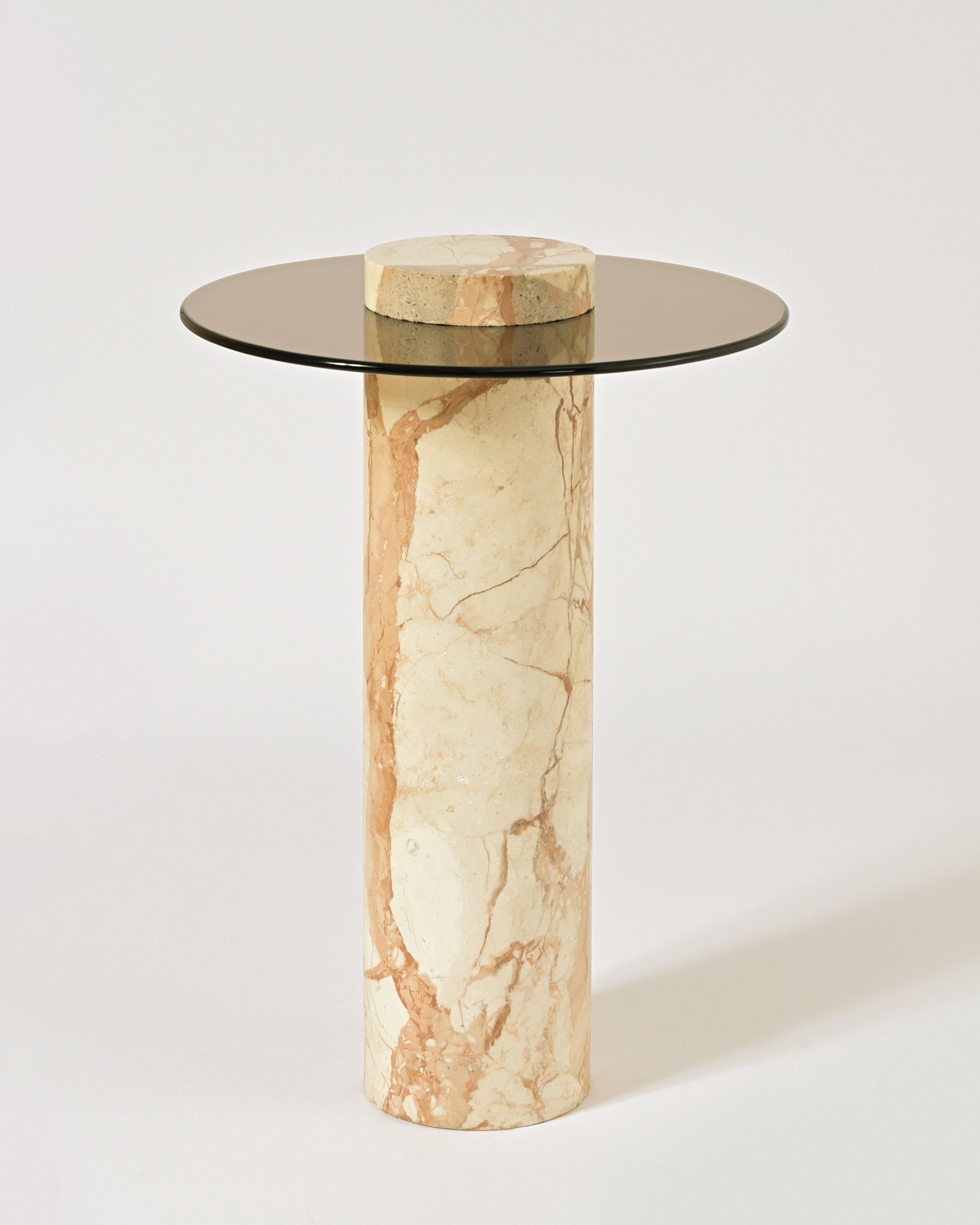 Dhir side table is a stone column with an extended glass top. A very simple yet modern design that states the marriage of two unconventional material, stone and glass.