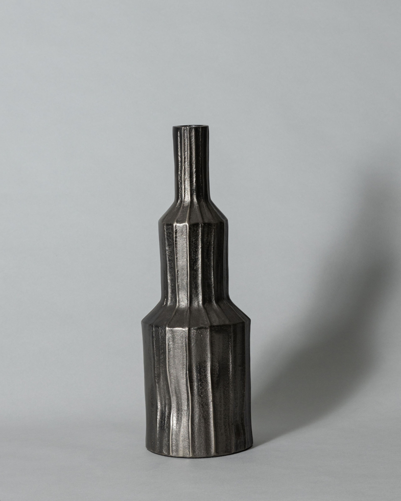 - The Kenai Vase: Cast in aluminium with a graphite finish, it interprets minimalism through mass and proportion. Its cool tone and sleek surface create an elegant counterpoint to vibrant floral arrangements or dried sculptural stems. Placed on a travertine console or marble dining table, it becomes more than an accent; it becomes the punctuation that defines the entire composition.