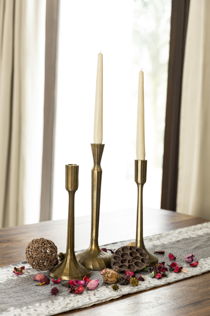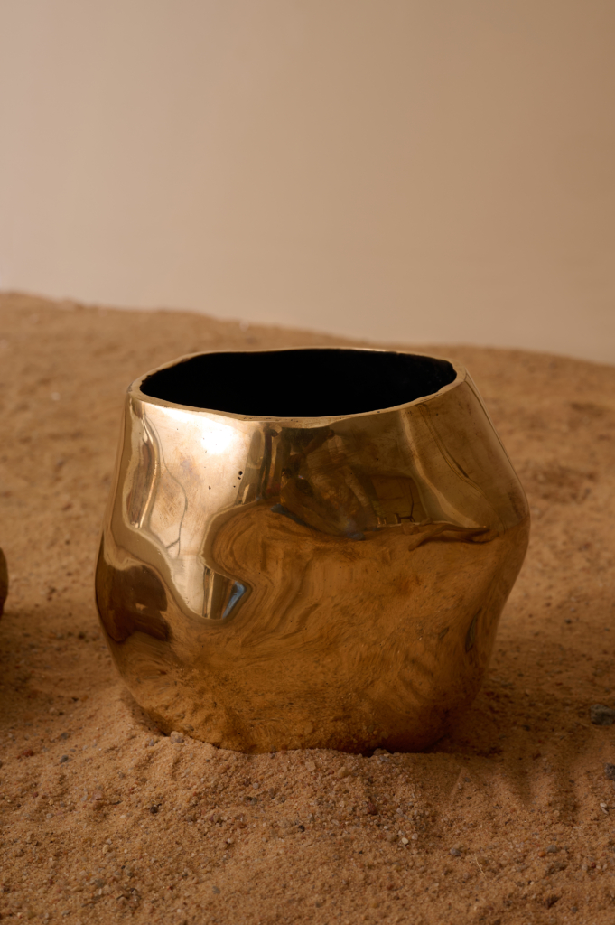 - The Sanee Candle Holder, functional sculpture in brass-finish metal, crafted to patinate.